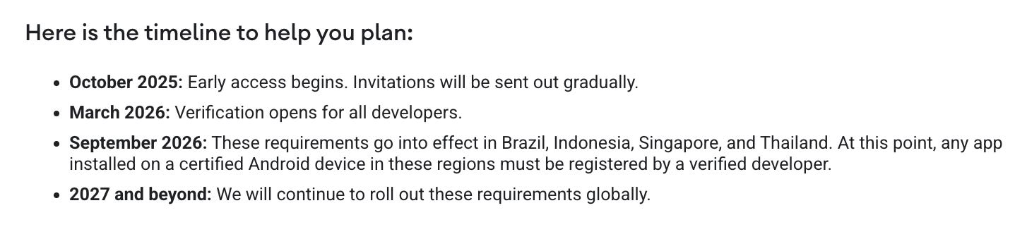 These requirements will go into full effect in September of 2026 (one year from now), but only for developers in four countries: Brazil, Indonesia, Singapore, and Thailand.