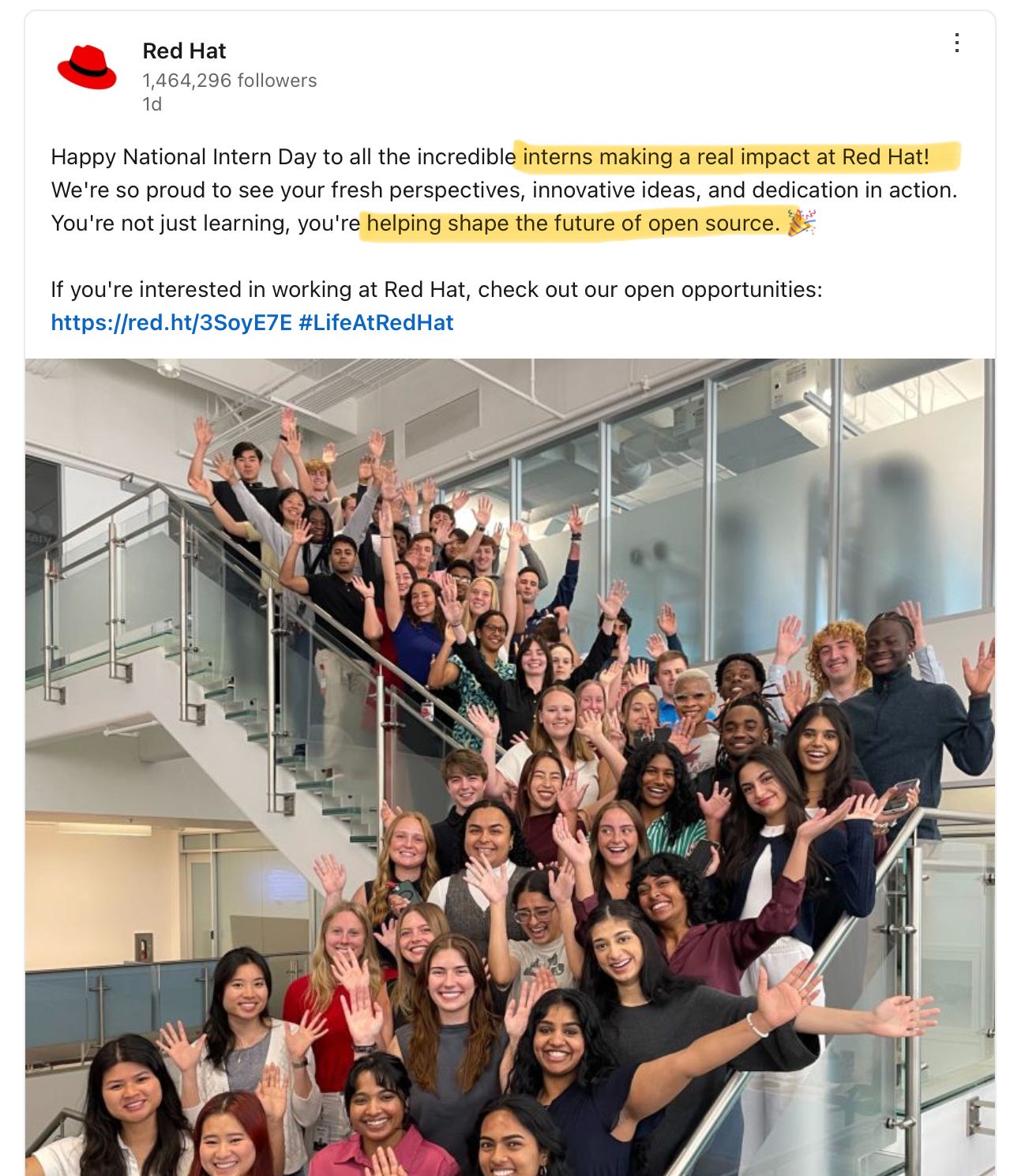 That said, considering the multiple pending lawsuits against IBM and Red Hat — specifically regarding their discriminatory policies towards White Men (and their previously stated goals of hiring less of them) — it is more than a little interesting that their latest crop of Red Hat interns is almost entirely… people who are not White Men.