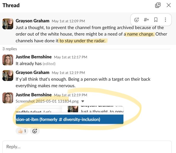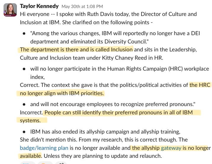 Employees are using that IBM DEI Slack channel to clarify corporate changes to DEI policy. Which, again, thanks to whistleblowers… we have screenshots of.