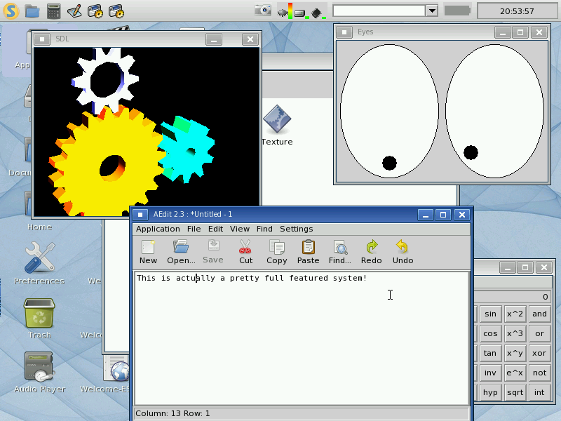 The default system ships with a handful of demo applications (including some 3D stuff and SDL stuff). And a variation on “xeyes” that follows your cursor around.