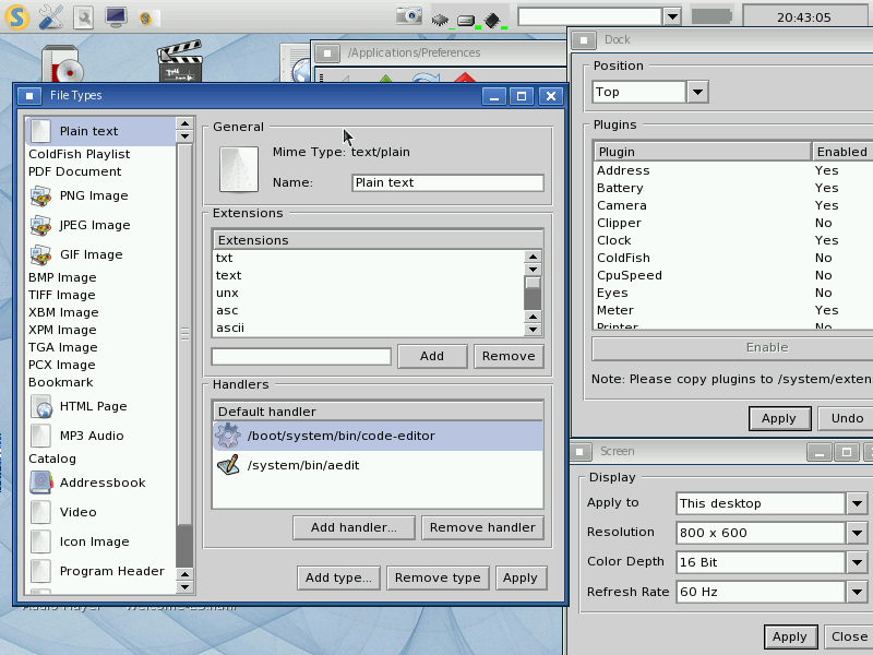 Syllable has a pretty robust system for handling file / mime types. Screen settings are super simple (and functional). The “dock” (the panel along the top) is fairly customizable, with a series of plugins.