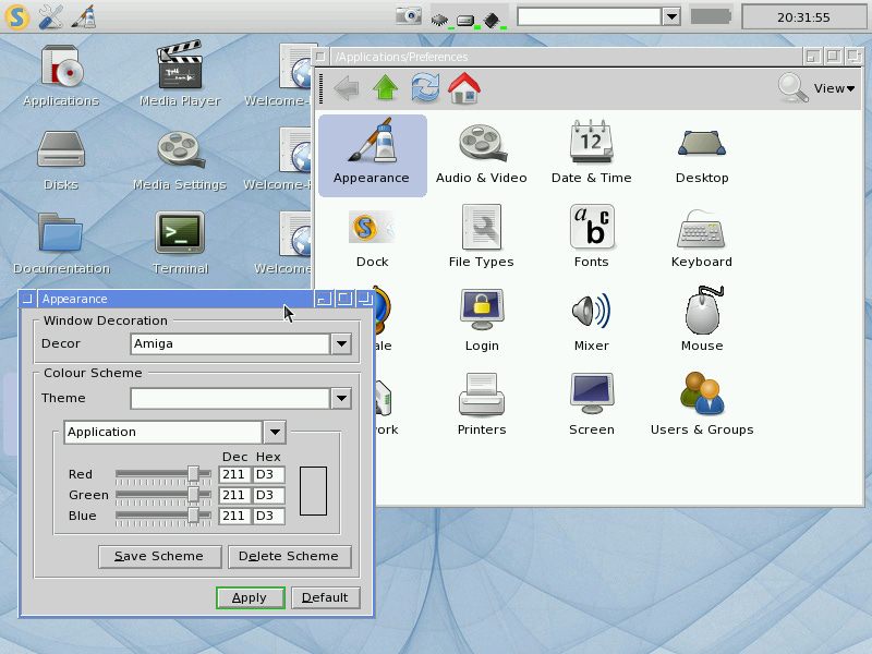 The Preferences icon on the desktop really just opens up a file browser with a bunch of individual Settings / Preferences applications. The Appearance application has pre-set themes that mimic BeOS, Windows95 (and XP), Amiga, OS/2 Warp, and a bunch of others.